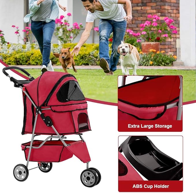 BestPet 3 Wheels Pet Dog Stroller Cat Cage for Medium Small Dogs Cats Travel Folding Carrier Waterproof Puppy Stroller with Cup Holder & Removable Liner,Red
