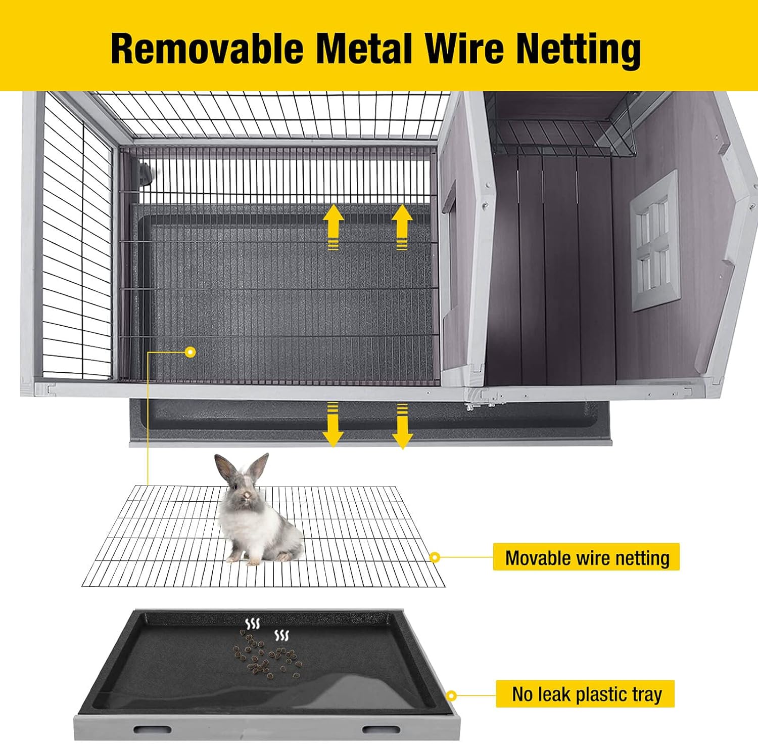 - Bottom Wire Floor: Removable metal wire netting above the tray, bunny will not standing on their poop. Super easy to clean your rabbit cage