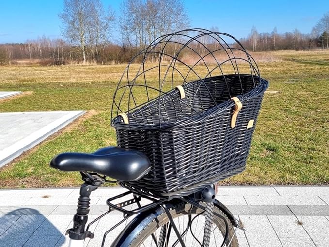 - Easy to Use & Secure Fit for Small Dogs Up to 20 lbs: This handmade wicker pet bike basket is designed for both convenience and security. Measuring 22" (top length), 18.1" (bottom length), and 14 1/2" (top width), 9 1/2" (bottom width) , it comfortably fits small dogs up to 17" long and about 20 lbs. The built-in mounting clamp locks directly onto rear bike racks between 5" to 6.5" wide. Simply place the basket on your rack, adjust the padded bracket, and tighten the knob for a snug, wobble-free fit—no tools required.