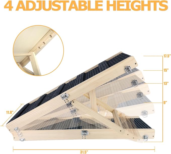 - 4 Adjustable Heights: Dog Climbing Ladder has 4 adjustable heights: 9 inches (23 cm), 13 inches (33 cm), 15 in ches(38 cm), and 17.3 inches (44 cm). Which is compatible with most home furniture. Adjust the ramp height to help your small pet get on and off beds, couches, and cars