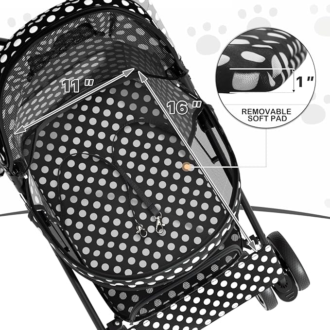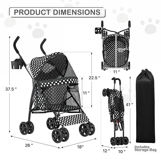 MoNiBloom 4 Wheels Pet Stroller, Easy-Fold Umbrella Shaped Dog Cat Jogger Stroller w/Storage Bag & Visible Mesh for Small/Medium Dogs Cats Black Polka Dots