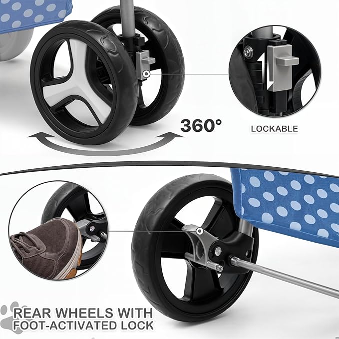 MoNiBloom 3 Wheels Pet Dog Cat Stroller for Small Medium Dogs Cats, Foldable Jogger Stroller w/Storage Basket and Cup Holder, Sky Blue Polka Dots