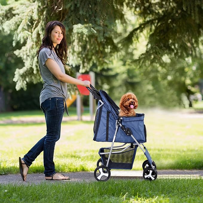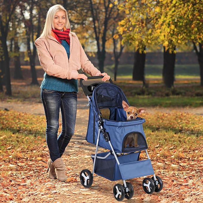 Pet Stroller 4 Wheels Dog Cat Stroller for Small Medium Dog Cats Carrier Jogger Travel Foldable Puppy with Storage Basket and Cup Holder (Navy Blue)