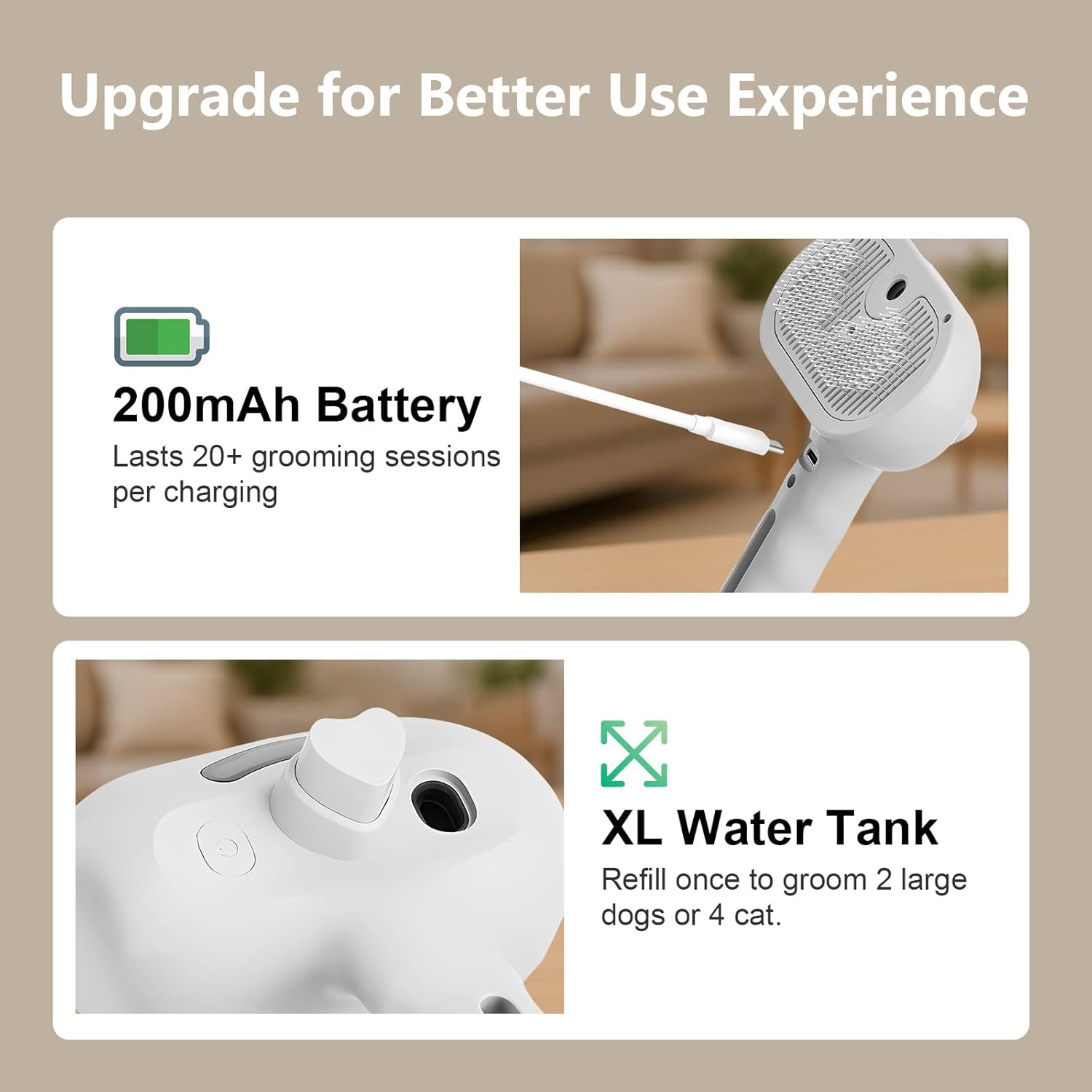 - XL Water Tank for All-Day Use--Holds 2x more water than others. Refill once to groom 2 large dogs (Labrador size) or 4 cats. Use plain water or add pet-safe serums for customized care.