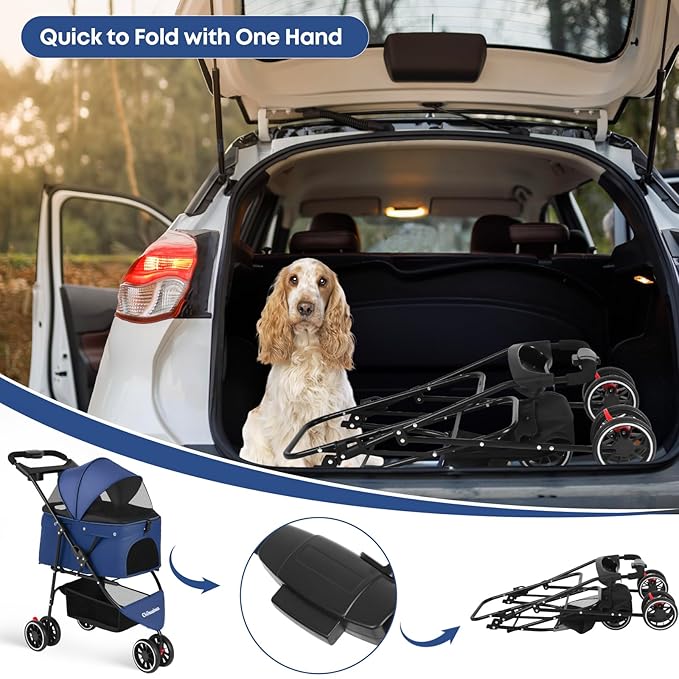 Pet Stroller,Dog Stroller for Small Medium Dogs Cats,3 Wheels,Foldable,with Breathable Mesh Canopy,Cup Holders,Easy Assembly,Navy Blue