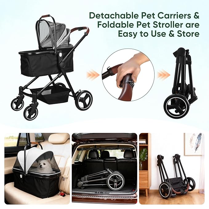 Foldable Dog Stroller, 3 in 1 Pet Stroller for Small Medium Dog Cat up to 50lbs, Detachble Portable Pet Bag, Storage Basket and One-Button Folding Frame