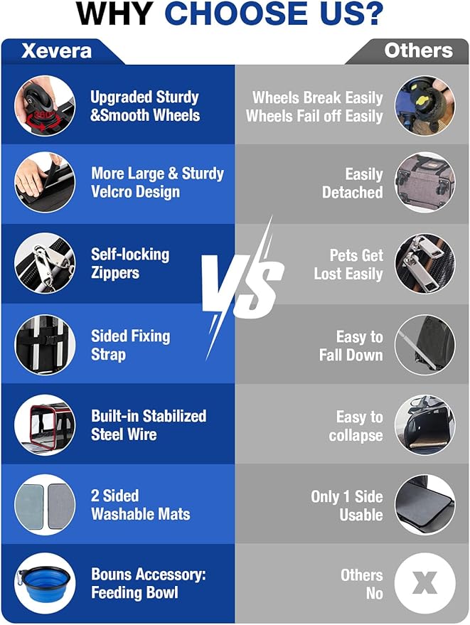 - More Sturdy and Convenient: The dog carrier with wheels is firmly structured to make sure its shape. Fixing strap in the side keeps the telescopic handle upright. 2 side storage pocket for pet treats and toys. A PET BOWL INCLUDED.